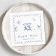 Serviettes mariages tendance d'inspiration rétro pour votre fête de fiançailles, dîner de répétition, réception de mariage, etc., avec un cadre bleu français ondulé orné de cordes de coquette, des illustrations fantaisistes dessinées à la main d'un coeur, d'étoiles et de verres à vin, et les noms de la mariée et du marié dans un scénario bleu ludique.