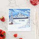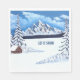 Serviettes avec une belle scène hivernale, comprenant des montagnes enneigées, une cabane et des conifères. Le texte peut être personnalisé. Œuvre originale de W.B.