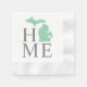 Les serviettes en papier élégantes présentent un design typographique avec du texte "Home" et une carte de l'état du Michigan. Le marqueur de la ville de coeur bleu marine peut être positionné sur la ville où vous habitez ou votre ville natale par Personnaliser. Gris fusain, vert jade/menthe et blanc.