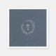 Une simple couronne de laurier ouverte de feuilles esquissés en écru clair entoure les initiales monographiques de la mariée et du marié sur un arrière - plan bleu marine. Le modèle de texte élégant et simple peut être personnalisé avec vos initiales. Ces serviettes sont disponibles en 3 tailles. Montré ici en taille cocktail, vous pouvez également commander ces serviettes en taille déjeuner ou dîner avec des bords simples ou forgés.