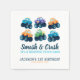Ce design présente un thème d'anniversaire de course automobile Monster Truck avec le titre "Smash and Crash It's a Monster Truck Bash" avec des camionnettes babyish mignonnes et colorés dans des couleurs bleu orange vert et violet. Ce produit peut être facilement personnalisé avec les détails de votre événement. Pour plus de produits correspondants, n'hésitez pas à m'envoyer un message sur Zazzle.