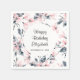 Serviettes d'anniversaire avec un élégant motif fait avec une aquarelle illustration de fleurs roses avec feuilles et tiges bleu-gris. Un cercle blanc superposé avec votre texte à l'intérieur.