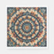 Un motif de courtepointe géométrique éclaire du centre, créant un design mandala complexe avec des couleurs variées : vert turquoise, brun rouille et beige