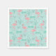 Serviettes en papier avec un motif fantaisiste. Flamants roses pastel sur un arrière - plan vert clair. Plaquettes de lis vert et fleurs de lotus. Jolie ambiance tropicale.