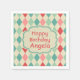Profitez d'un look rétro amusant qui rappelle le cirque avec ce design personnalisé arlequin dans les tons turquoise, menthe, rouge, rose et beige. Entrez votre texte dans le modèle de design pour personnaliser cette serviette pour votre événement. Des assiettes de soirée correspondantes sont disponibles dans ce design.