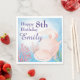 C'est une jolie serviette de célébration d'anniversaire personnalisée avec une illustration sous le thème de la mer. Un axolotl rose mignon nage en bas à droite, avec du feuillage sous-marin le long du fond. Une bordure d'eau bleue défraîchie encadre la serviette.