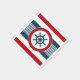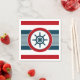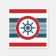 Nautical design with sailing wheel decoration in round shape on blue, red and white striped background