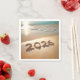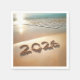 Year "2026" are etched into smooth sand as gentle ocean waves approach the shoreline, illuminated by the warm glow of the sun