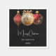 Un arrière - plan noir, un texte blanc. Décoré de 3 boules rouges et faux or et étoiles dorées. Texte : Joyeux Noël. Personnalisez et ajoutez votre nom de famille et votre année.