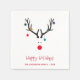 Une jolie image moderne et minimaliste d'une tête de renne avec un nez rouge. Avec des ornements de Noël, des billes accrochées aux bois. Pas de couleur arrière - plan, Couleurs : blanc, rouge, gris, bleu, vert. Un script de style manuscrit moderne rouge avec le texte : Joyeuses Fêtes. Modèle pour votre nom de famille ou votre texte.