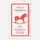 Ce magnifique paquet de serviettes en papier de Noël a une image art numérique d'un mignon cheval à bascule de style scandinave. Le cheval est rouge avec une crinière rouge foncé, la queue et les sabots. Le cheval sympathique sourit. Il a une selle blanche et des rois avec de jolis motifs de style Scandi rouge sur la selle, y compris le soleil, la lune et les étoiles, les coeurs et les fleurs. La base du cheval rocking est rouge et est couverte de feuilles blancs. Le design a été inspiré par le cheval suédois Dala. Il y a du texte personnalisé pour que vous puissiez inclure un message.
