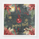 Un design luxueux et festif de serviette de Noël avec un arrière - plan de nuit de forêt vert foncé avec des flocons de neige dorés, des poinsettias aquarellées, des cônes de pin, des baies rouges avec une lanterne chaude éclairée et un ornement de boule rouge brillant sur ruban rouge tombant en plein air et Joyeux Noël écrit en écriture de brosse d'or. Feliz Navidad, Joyeux Noël et Joyeuses Fêtes sont ajoutés à cette serviette. Customisez-les et personnalisez-les en utilisant l'outil Modifier avec design.