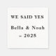 Portez un toast à jamais avec des serviettes personnalisées "We Said Yes" — une touche parfaite pour les fêtes de fiançailles et les célébrations. Ajoutez vos noms et votre année comme "Bella & Noah - 2025" pour marquer le début de l'éternité. Imprimé sur de luxueuses serviettes à 3 plis, avec un look audacieux et propre pour les histoires d'amour.