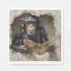 Un chimpanzé regarde à travers un trou dans un mur avec une expression curieuse tout en tenant un journal. Les bords du trou sont déchiquetés, suggérant qu'il a été cassé, et le mur semble vieux et patiné.