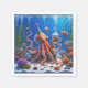 Un poulpe orné d'un casquette de fête brandit une tasse de bière mousseuse parmi des coraux colorés et des poissons clowns sur une scène sous-marine.