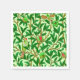 Serviettes en papier dans une tapisserie de William Morris Art Nouveau motif d'oiseaux exotiques dans un grenadier, avec feuilles vert émeraude, oiseaux et fruits en vert citron et rouge rubis profond, et arrière - plan vert citron pastel