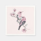 Serviettes en papier avec peinture aquarelle. 2 oiseaux roses et noirs assis sur une branche d'arbre aux fleurs roses.