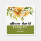 This elegant fall wedding paper napkin showcases a beautiful rhododendron branch adorned with delicate orange yellow lowers and greenery at the upper part. The couple's names are prominently displayed in bold typography, adding a personal touch to the design. A heartfelt message of 'Thank You' is also included, expressing gratitude to the guests. Completing the look, a stylish olive green band gracefully adorns the bottom of the napkin, adding a touch of sophistication to any wedding celebration.