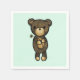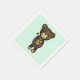 Serviettes en papier avec une simple illustration d'un ours caricaturé brun tenant une marguerite jaune. Placé sur un arrière - plan vert pâle.