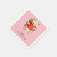 Serviettes en papier avec une jolie illustration aquarelle. Un ours en peluche brun portant un grand coeur rouge. Pois jaune clair sur un arrière - plan rose.