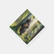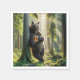 Un ours se tient debout contre un arbre tenant une tasse de bière avec une patte dans une forêt ensoleillée