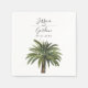 Un ensemble unique de serviettes en papier sur le thème du palmier, spécialement adaptées à votre futur mariage sur la belle côte ou l'île. Elles présentent une illustration de style minimaliste d'un seul palmier. Au-dessus se trouvent les noms uniques de la mariée et du marié dans une police élégante de style cursif.