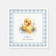 Des serviettes en papier de première année "Un canard chanceux" avec un design mignon et un motif en vichy bleu.