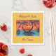 Image paradisiaque tropicale créée en points de couleurs brillantes. Silhouette noire de deux palmiers sur une petite île avec deux voiliers jumeaux de part et d'autre. Soleil au centre. Eau et ciel aquatiques en rouge et jaune. Bordure de jaune foncé. Personnalisez avec le/les nom(s) de célébrant(s) en haut et salut de célébration en bas. Art original de Deanna Pendrick.