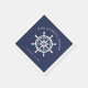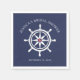 Serviettes en papier pour mariage ou occasion spéciale sur le thème marin avec des rayures bleu marine, roue de bateau avec police incurvée.