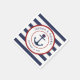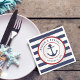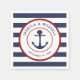 Serviettes en papier pour mariage ou occasion spéciale sur le thème nautique avec des rayures bleues marines, une ancre avec police courbe superposée sur un cercle avec contour rouge.