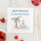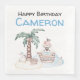 Ces serviettes de fête d'anniversaire personnalisées ont un thème de pirate mignon. L'image d'un bateau de pirates se trouve au fond, à proximité d'une île avec un coffre au trésor et de l'or. Un petit mouette est photographié debout sur l'île, et un message dans une bouteille est vu flottant dans la mer. Un message "Joyeux anniversaire" est imprimé en haut, suivi d'un exemple de nom que vous pouvez personnaliser pour inclure votre propre nom personnalisé ou autre texte.