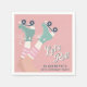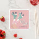Des serviettes d'anniversaire pastel rose patinage amusantes, illustrant une illustration rétro de patins à rouleaux turquoises sur une fille portant des chaussettes à tube rose et "Let's Roll" en écriture blanche. Ajoutez son nom de typographie bleu turquoise foncé.