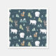 Serviettes en papier avec un motif fantaisiste. Ours polaires, rennes, arbres, renards et flocons de neige. Sur un arrière - plan vert foncé.