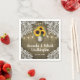 Country Rustic Sunflower Mason Jar Mariage serviettes - dispose d'un arrière - plan unique en bois de grange avec élégante dentelle et des lampes à cordes scintillantes. Ce design comprend également un bocal en maçon plein de tournesols et de respiration pour bébé. Le bocal de mason est décoré d'initiales que vous pouvez changer à celles de votre choix.