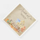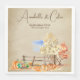 Ces serviettes mariages romantiques d'inspiration automnale présentent une image d'aquarelle d'un paysage d'automne. Des arbres aux couleurs chatoyantes jaune et orange créent un auvent sur une clôture de ferme en bois. Trois citrouilles et une corbeille de pommes sont placés devant la clôture, sur un tas de feuilles. L'arrière - plan est décoré d'un papier parchemin rustique.
