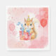 Girl's birthday party personalized paper napkins with a cute watercolor squirrel wearing a birthday hat and a holding a gift illustration. The background is pink and red with a watercolor texture. You can add your daughter's name and age in the personalize area.