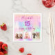 Pour une Quinceañera, fête du 15e anniversaire. Un collage de 3 de vos photos d'elle-même, d'amis, de famille, d'intérêts ou d'animaux de compagnie. Un arc-en-ciel féminin, arrière - plan de couleur holographique en violet, rose, or rose et vert menthe. Décoré avec des gouttes de parties scintillant, la peinture goutte à goutte. Personnalisez et ajoutez son nom et son âge de 15 ans. Le texte : joyeux anniversaire est écrit avec un script de style à la main tendance avec des swashes. Texte de couleur violette.