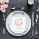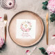 A white background, decorated with watercolored pink and ivory flowers in a wreath and a golden cross. A pink bow. Personalize and add the name and date.