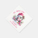 Créez des serviettes personnalisées en papier blanc et rose pour la fête d'anniversaire de la première petite fille dans le thème "Oh, What Fun". Ces serviettes ont un mignon pingouin dans un chapeau de Père Noël et une écharpe, assis avec un bonhomme de neige entouré de verdure et d'ornements de vacances. Le modèle permet de taper facilement le nom de fille d'anniversaire, qui est conçu dans une police de script décontracté.