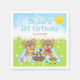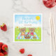 Cette serviette mignonne et capricieuse présente des ours adorables qui pique-niquent sur un tissu bleu en vichy avec des friandises comme du miel, de la pastèque, de la confiture de fraise, de la limonade et de la tarte. Dans l'arrière - plan est un ciel bleu vif et soleil, papillons et marguerites. Le texte combine les polices décoratives et serif pour un look élégant et moderne. C'est parfait pour un anniversaire de printemps ou d'été.