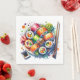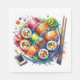 Un joli dessin animé d'une assiette de rouleaux de sushi, sauce soja et baguettes. Ces serviettes sont super mignonnes pour une fête d'anniversaire sur le thème du Sushi.