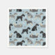Les chiens Schnauzer mignons en noir, sel et poivre et les manteaux noirs et argent s'assoient, se tiennent et se retournent avec des os de chien éparpillés et des empreintes de pattes sur un arrière - plan bleu clair.