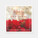 Des serviettes en papier avec une photo de fête avec un bouquet de poinsettias rouges sur le fond. Des lumières dorées chatoyantes dans l'arrière - plan. Style élégant et élégant. Jolie typographie de Noël écrite dans une police rouge tendance.