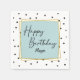 Un design contemporain amusant, cette serviette en papier de fête d'anniversaire présente des pois de confettis éparpillés en noir sur un arrière - plan blanc. Un cadre double doré à l'arrière - plan bleu pastel poussiéreux entoure le texte dans un style féminin. Un joli visage manuscrit type de script épelle "Joyeux anniversaire" en gros lettrage pour ajouter de l'accent à l'occasion heureuse. Ce design polyvalent convient aux adolescents, aux ados et aux adultes. Personnalisez avec le nom de l'invité d'honneur.