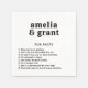 Serviettes mariages de style moderne avec un agencement simple et minimal avec vos noms dans une police rétro super ainsi qu'une liste de faits amusants sur la mariée et le marié. Le jeu de couleurs est noir et blanc. Les polices / couleurs peuvent être modifiées dans l'outil d'édition de conception. Ces serviettes amusantes ajoutent un élément amusant à votre réception de mariage, à votre fête de fiançailles ou à votre douche nuptiale.