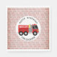 Serviettes de fête d'anniversaire avec illustration d'un camion-feu rouge au-dessus d'un arrière - plan en brique. Personnalisez le texte. Des plaques de correspondance, des invitations, des autocollants et d'autres articles de fête d'anniversaire de coordination sont disponibles à Jill's Paperie.