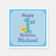 Mignonnes serviettes pour ton garçon d'anniversaire. Un numéro bleu décoré de pois bleu clair. Une jolie étoile jaune joyeuse aux grands yeux bleus. Au-dessus et au-dessous du numéro un sont les mots Joyeux Anniversaire. En bas se trouve un modèle texte pour ajouter le nom des garçons d'anniversaire.