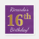 Ce design simple de serviette en papier comporte un message comme "16e anniversaire de Riccardo !", avec le "16e" à l’apparence d’or imitant, sur un arrière - plan de couleur violette. Le nom peut être customisé. Il pourrait être utilisé à une fête d'anniversaire pour quelqu'un qui célèbre son seizième anniversaire. [~Z0000085]