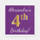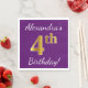 Ce design simple de serviette en papier comporte un message comme "4e anniversaire d’Alexandra!", le "4e" ayant une apparence de faux or, sur un arrière - plan de couleur violette. Le nom peut être customisé. Il pourrait être utilisé à une fête d'anniversaire pour quelqu'un qui célèbre son quatrième anniversaire. [~Z0000085]