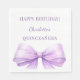 A white background color. Decorated with a large lavender colored bow. Personalize and add the name and date. Text: Happy Birthday!
